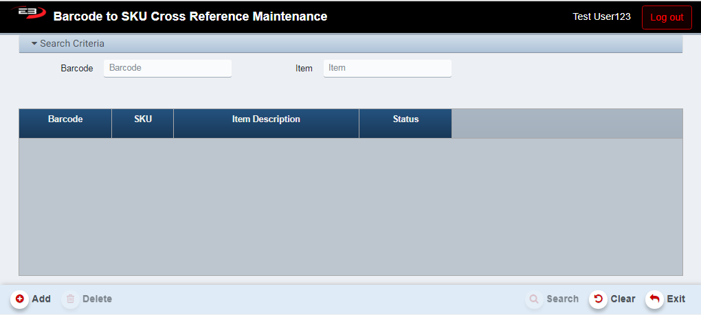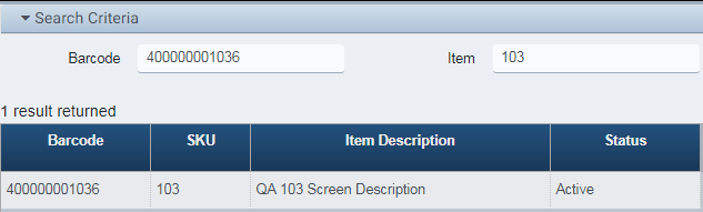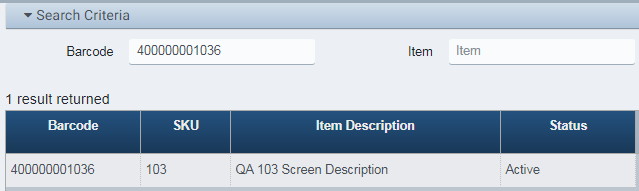 The user may enter the Barcode number or the item’s SKU (or both) and click Search.