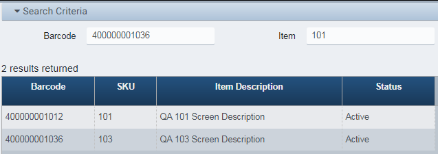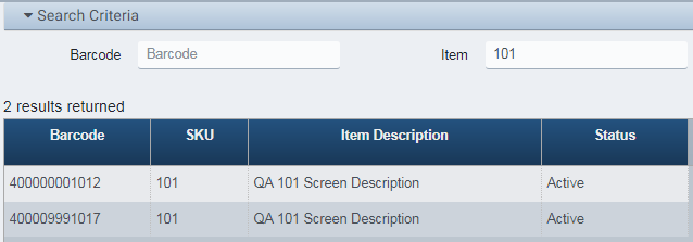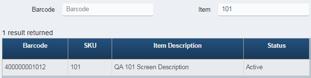 If only an Item (SKU) is entered, each matching Barcode for that item, if any, is returned.