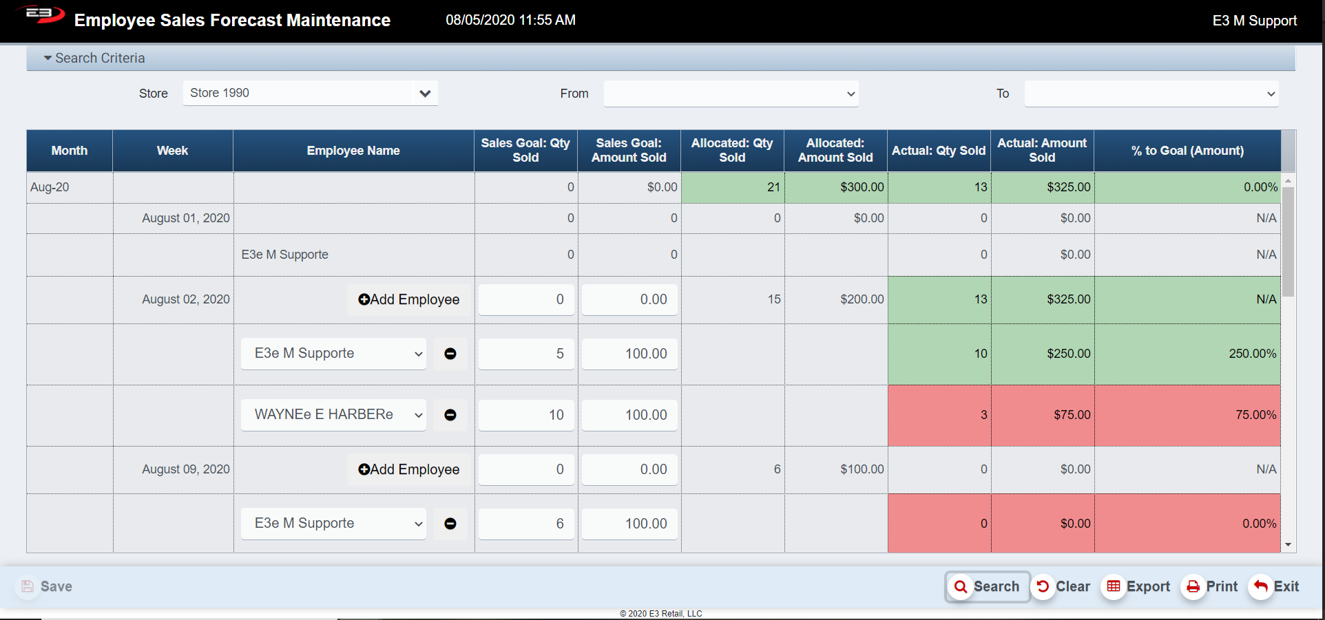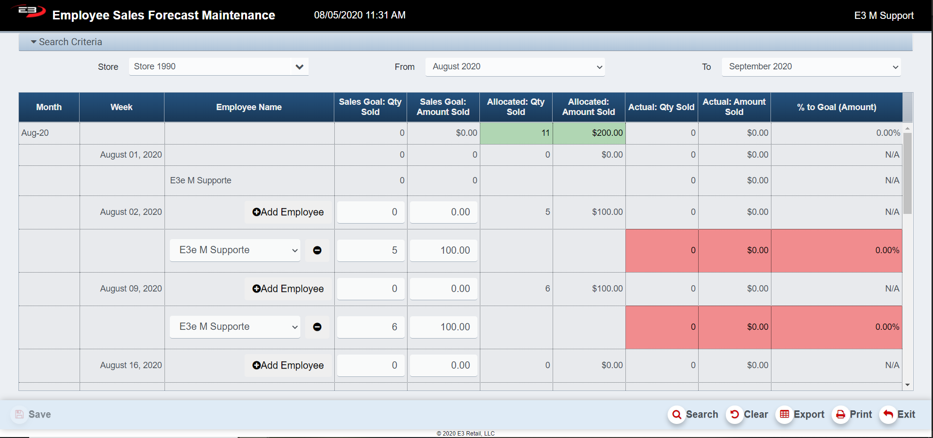 If a sales goal quantity or sales goal amount field is higher than the actual sales quantity or the actual sales amount the field, the field will get highlighted in red.