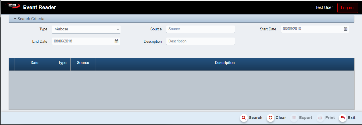 The Print function allows the user to save the event report as an Acrobat PDF file for viewing/printing in Adobe Acrobat Reader. Once you have a result set that’s filtered as desired, click the Print button. The file is saved as EventReader.pdf in the default location, typically the Downloads folder for the user.