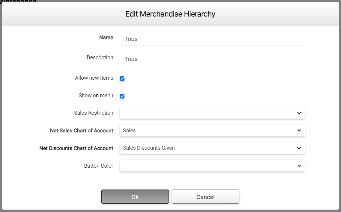 The Sales Restriction drop-list lets the operator select a sales restriction for the MH level being edited. A blank selection for the Sales Restriction setting indicates no sales restrictions are active. At the present time this is not implemented. The restriction choices are here, blank indicates no sales restrictions: