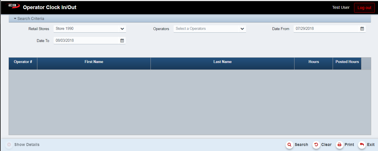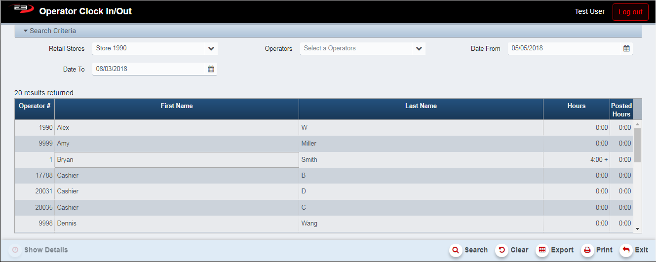 From the Operator Management / Reports menu, select Operator Clock In/Out.