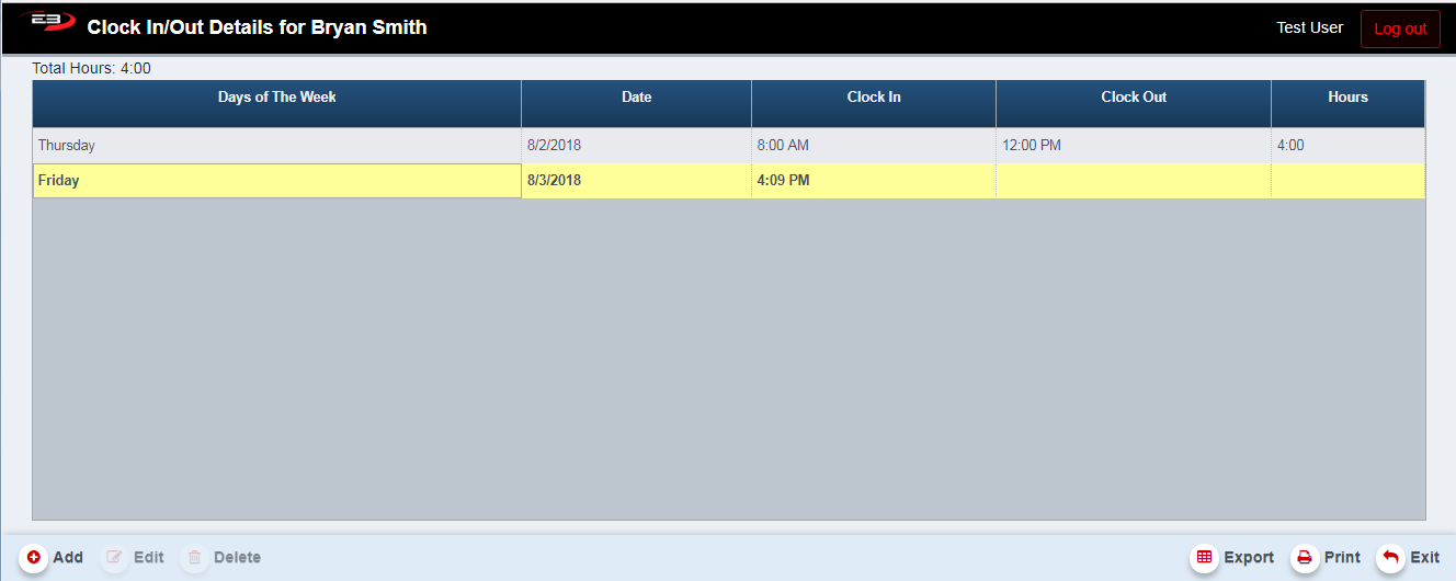 A complete shift has both Clock In and Clock Out times, plus the number of hours in the shift.
