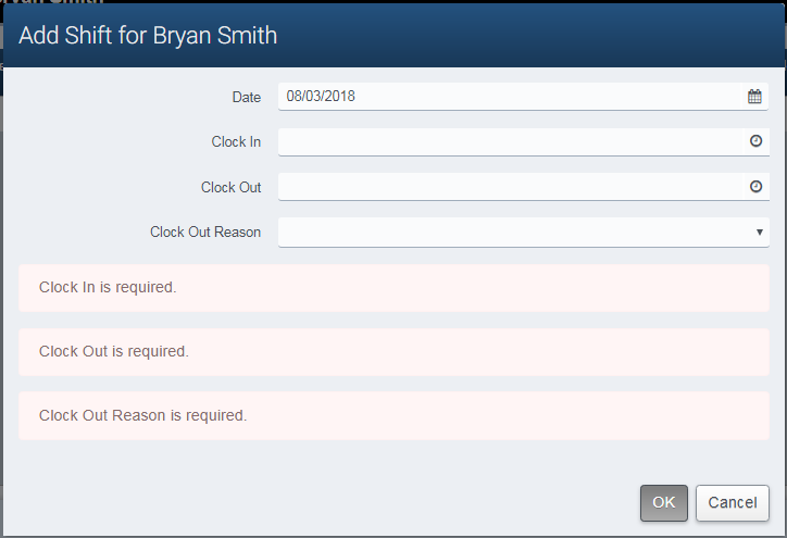 Date, Clock In, Clock Out, and Clock Out Reason are all required fields.