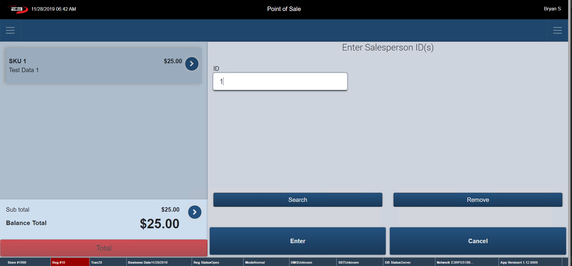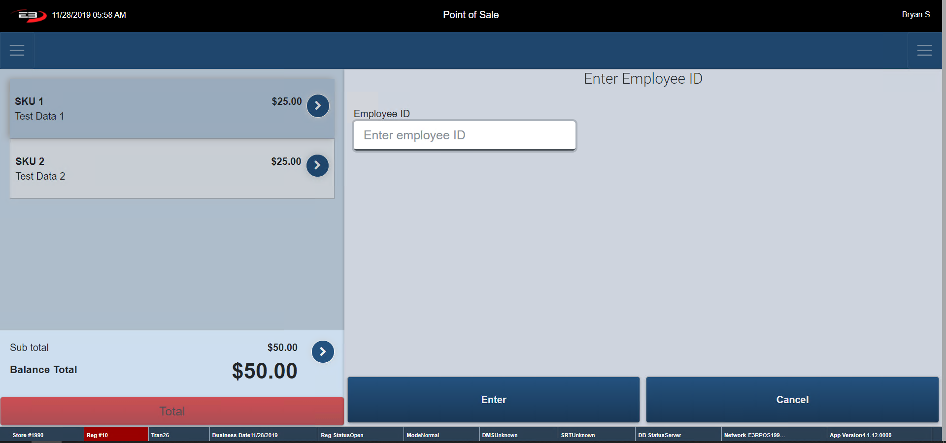Enter in the ID of the employee who wishes to purchase the item and click Enter. To Cancel, click Cancel. The register returns to the Item Entry Screen.