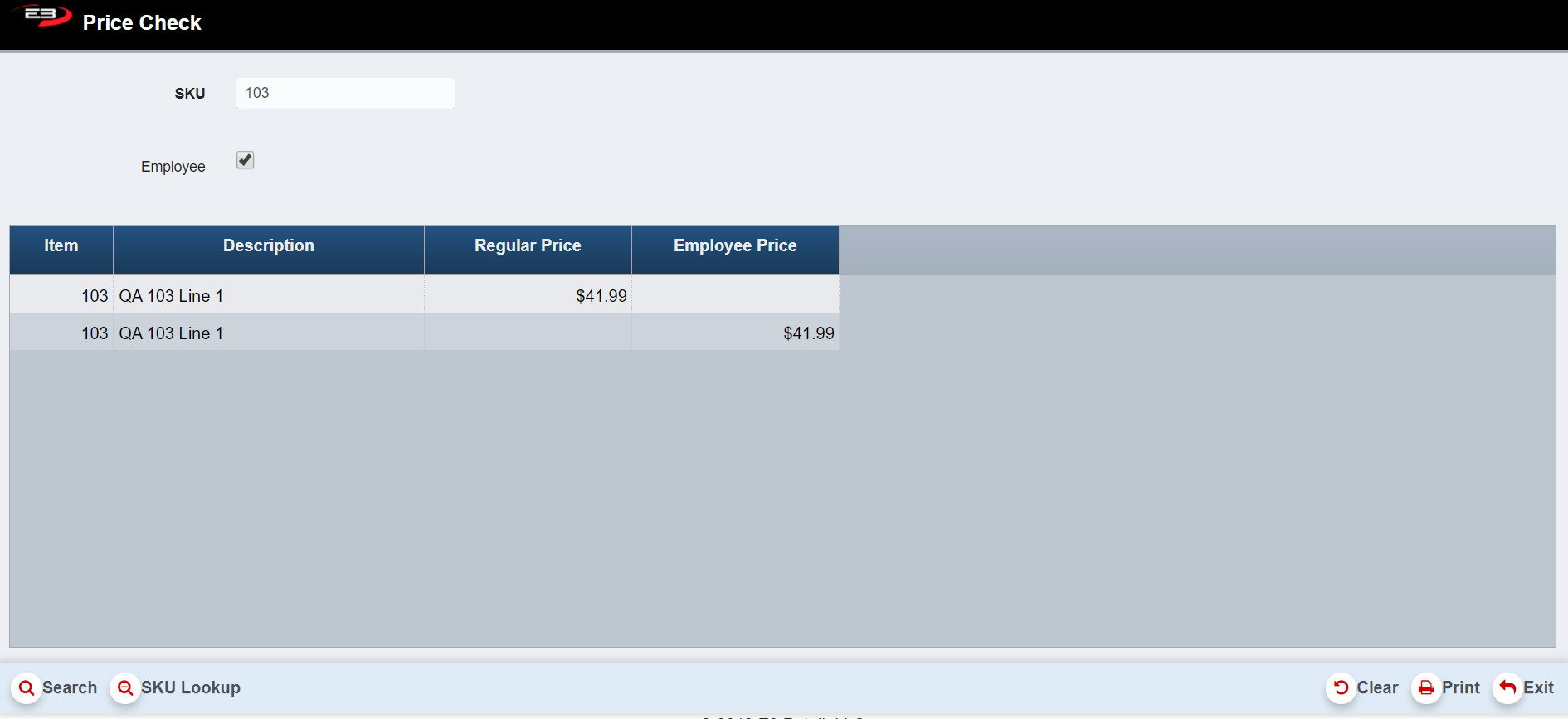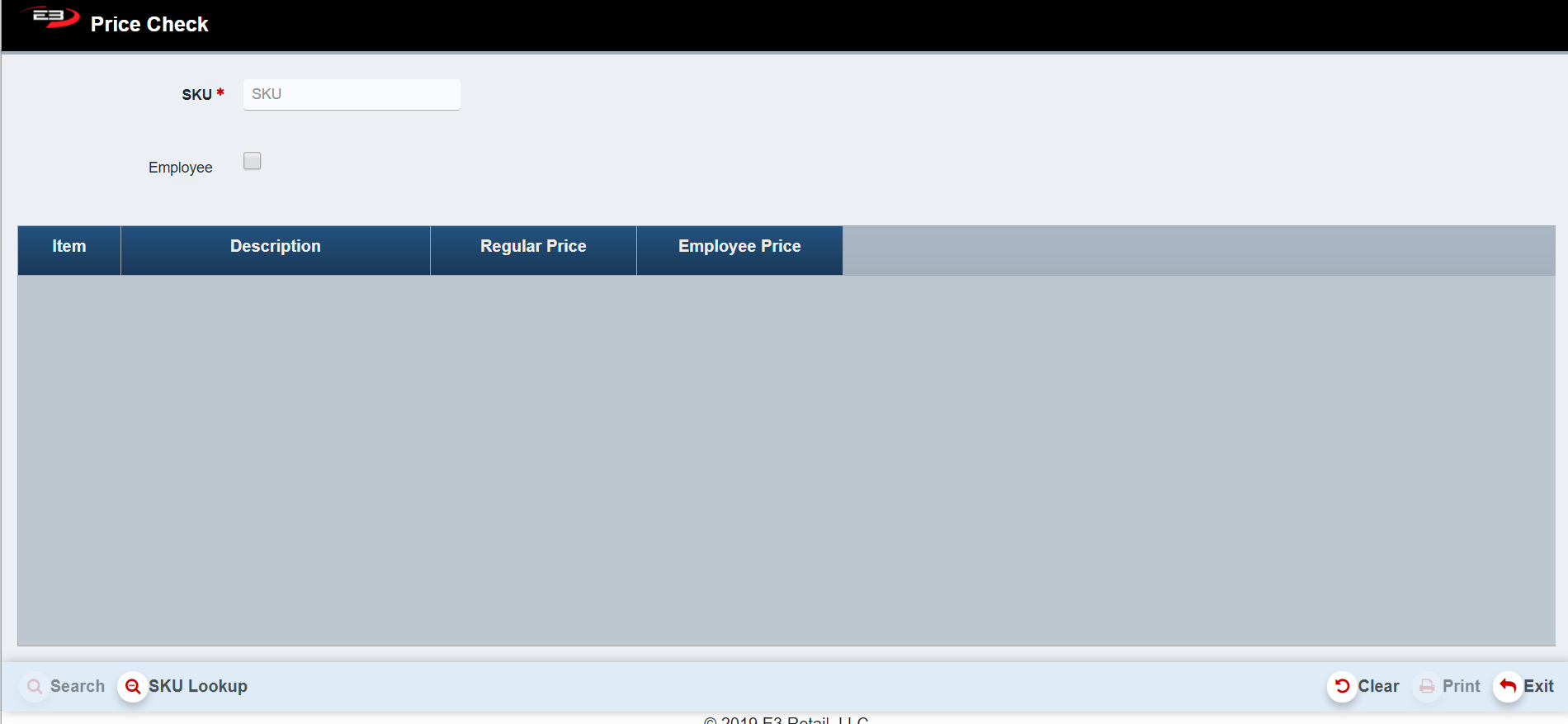 Enter in a SKU number and click Search (click Employee box to search for a SKU price for an employee)