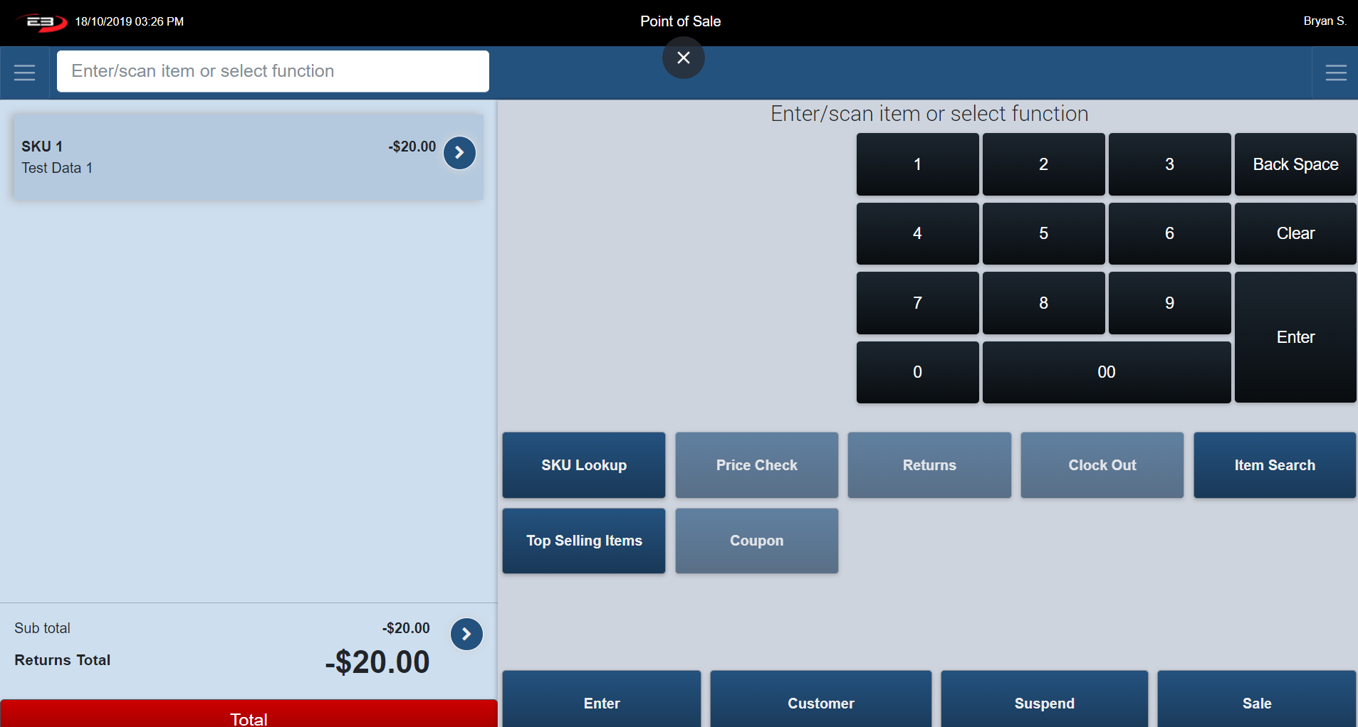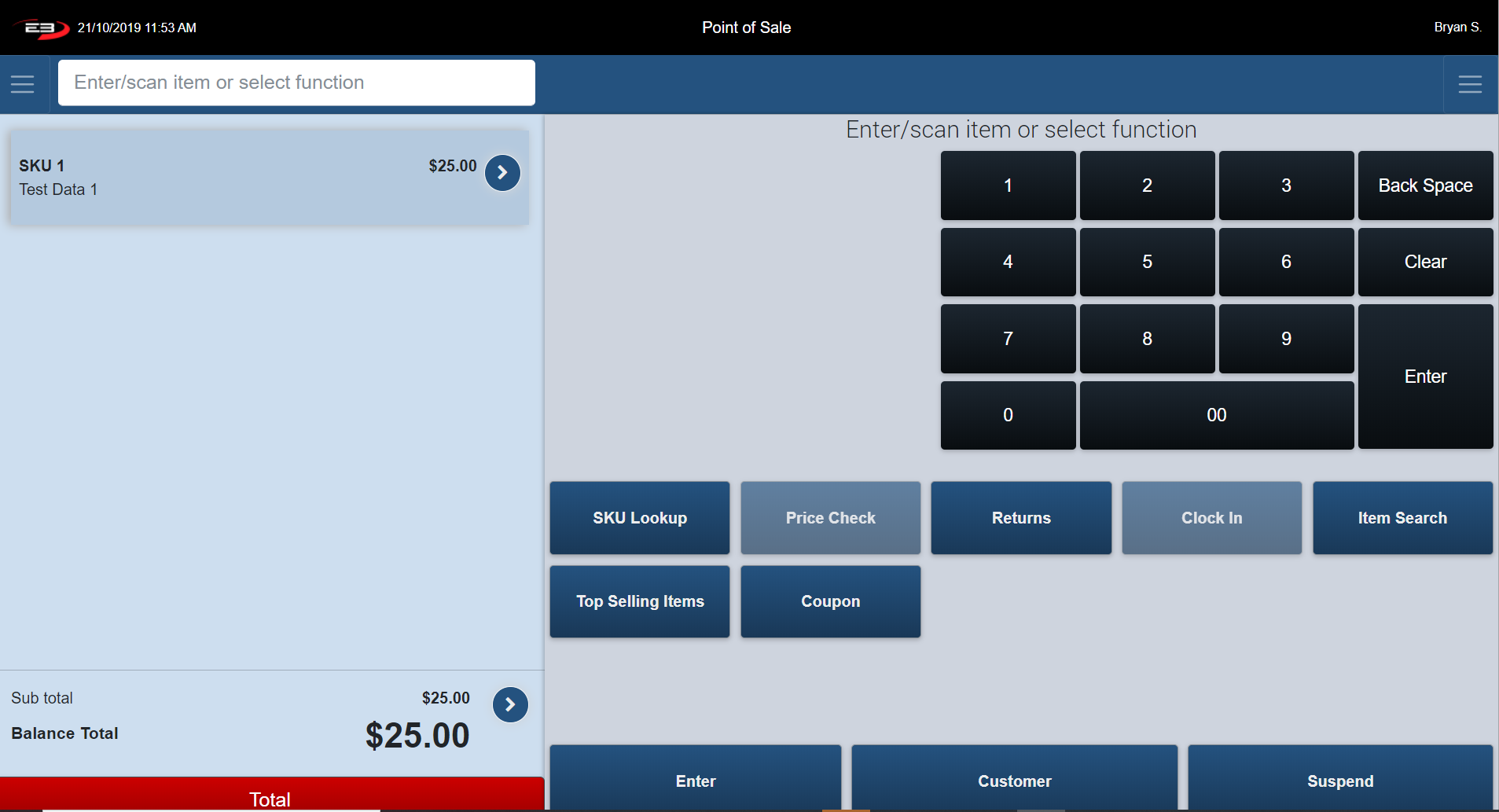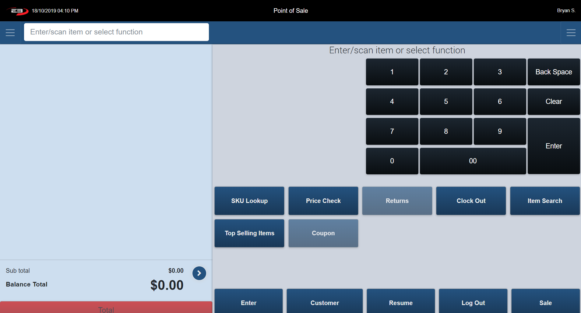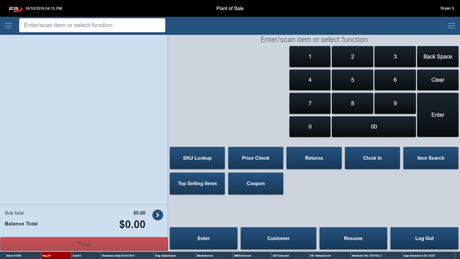 The Item Entry Screen is the home screen of the register. The Item Entry Screen comprises many Point of Sale function keys. These function keys are arranged vertically underneath the keypad.