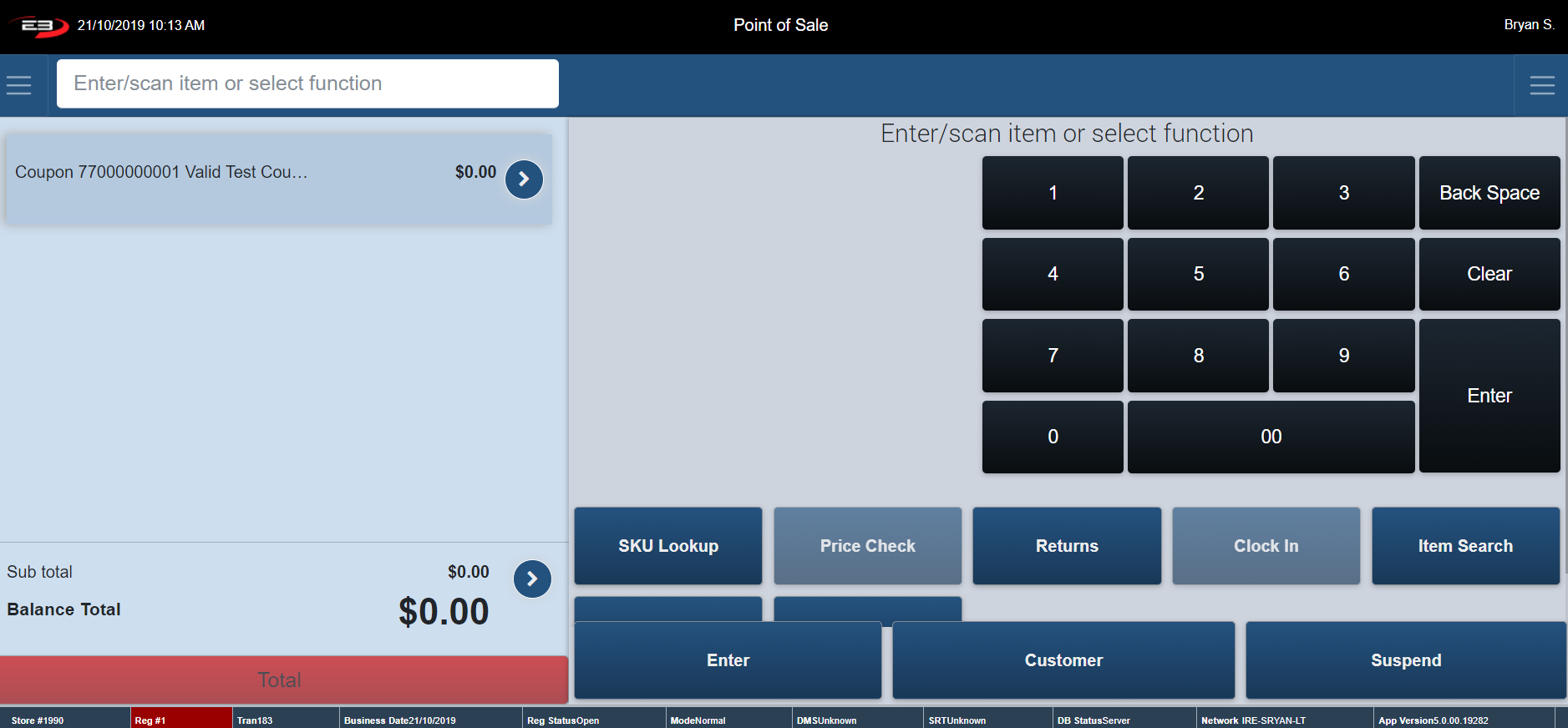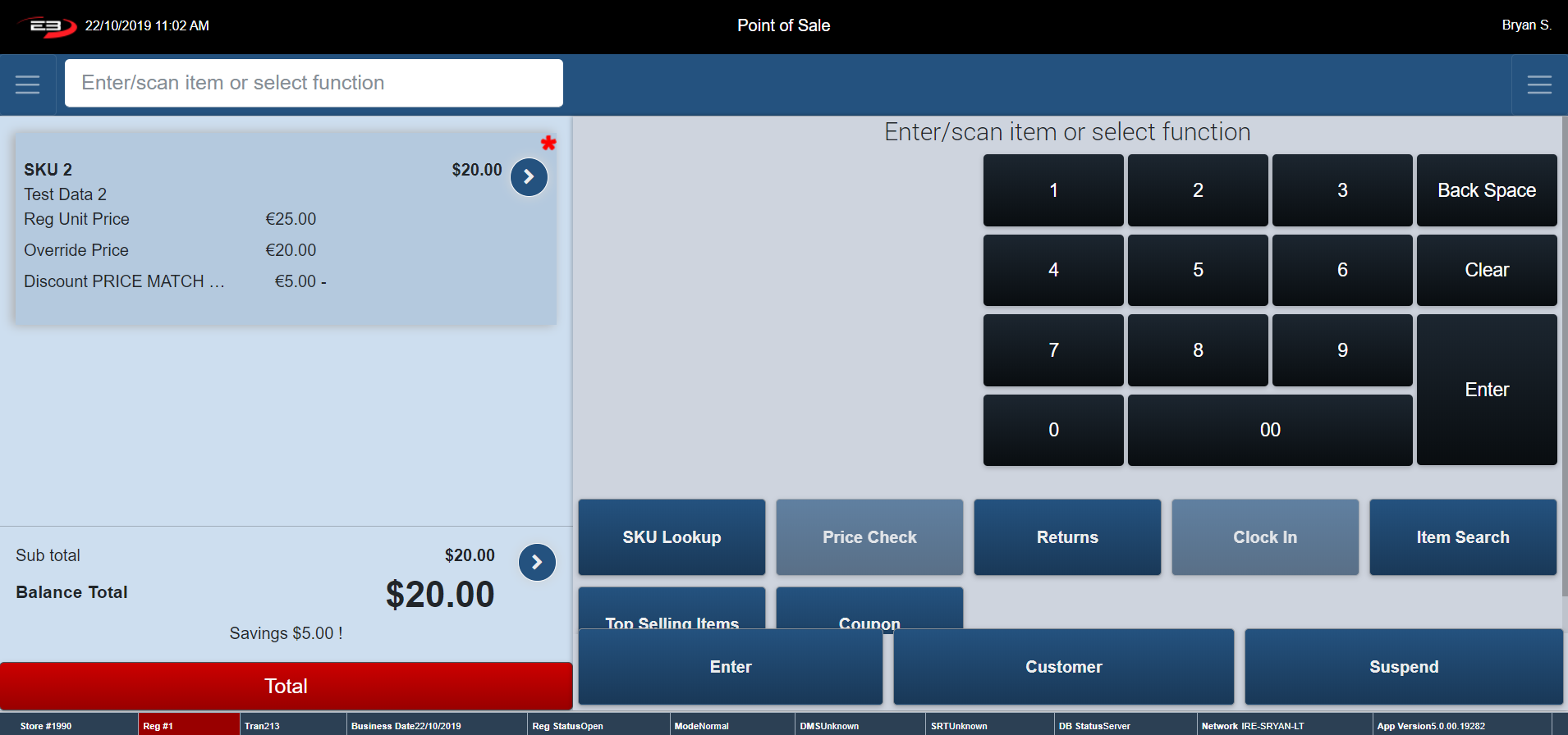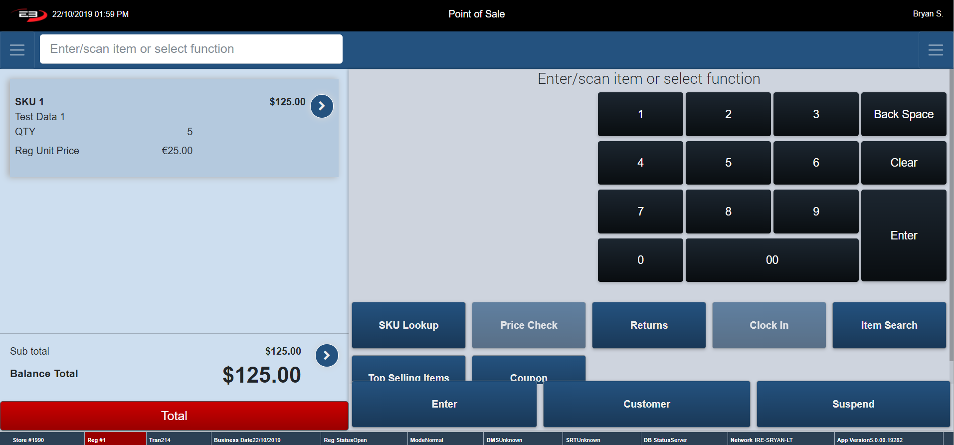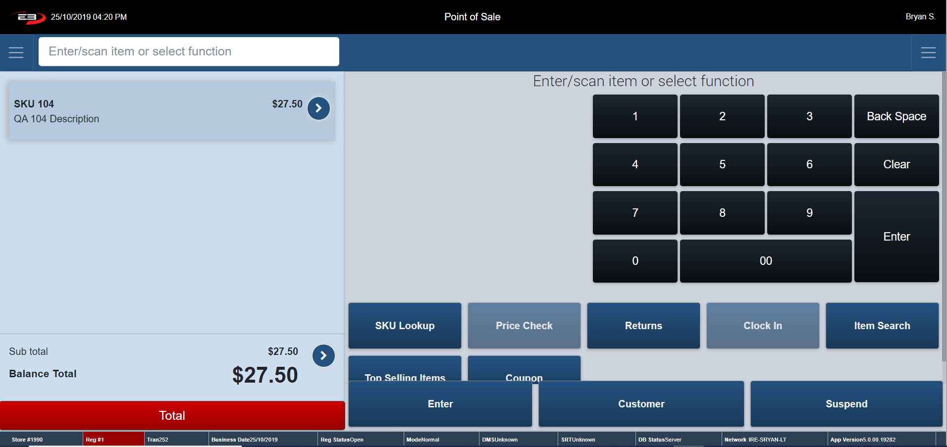 The Item Entry Screen is the home screen of the register. The Item Entry Screen comprises many Point of Sale function keys. These function keys are arranged vertically underneath the keypad.