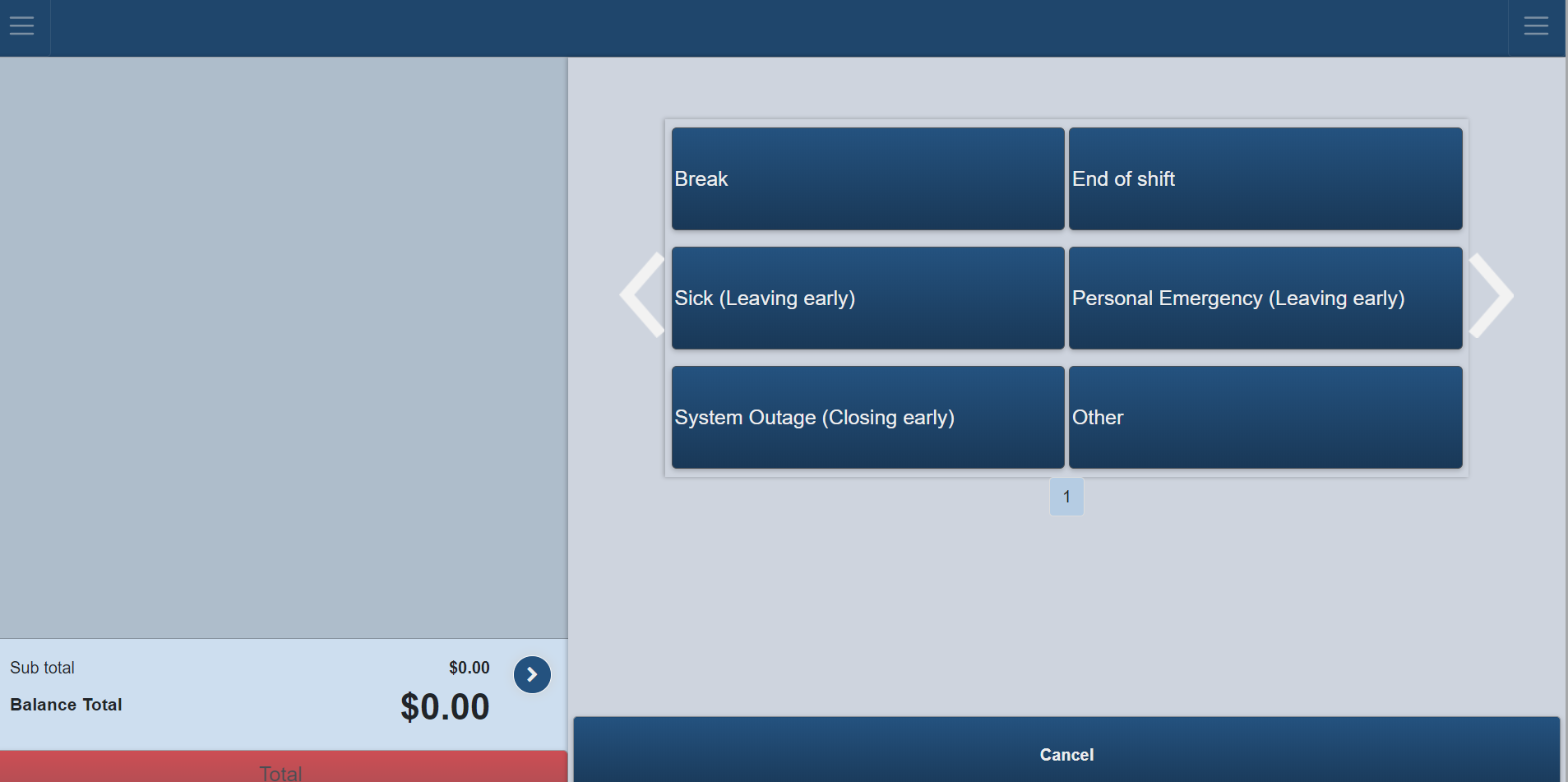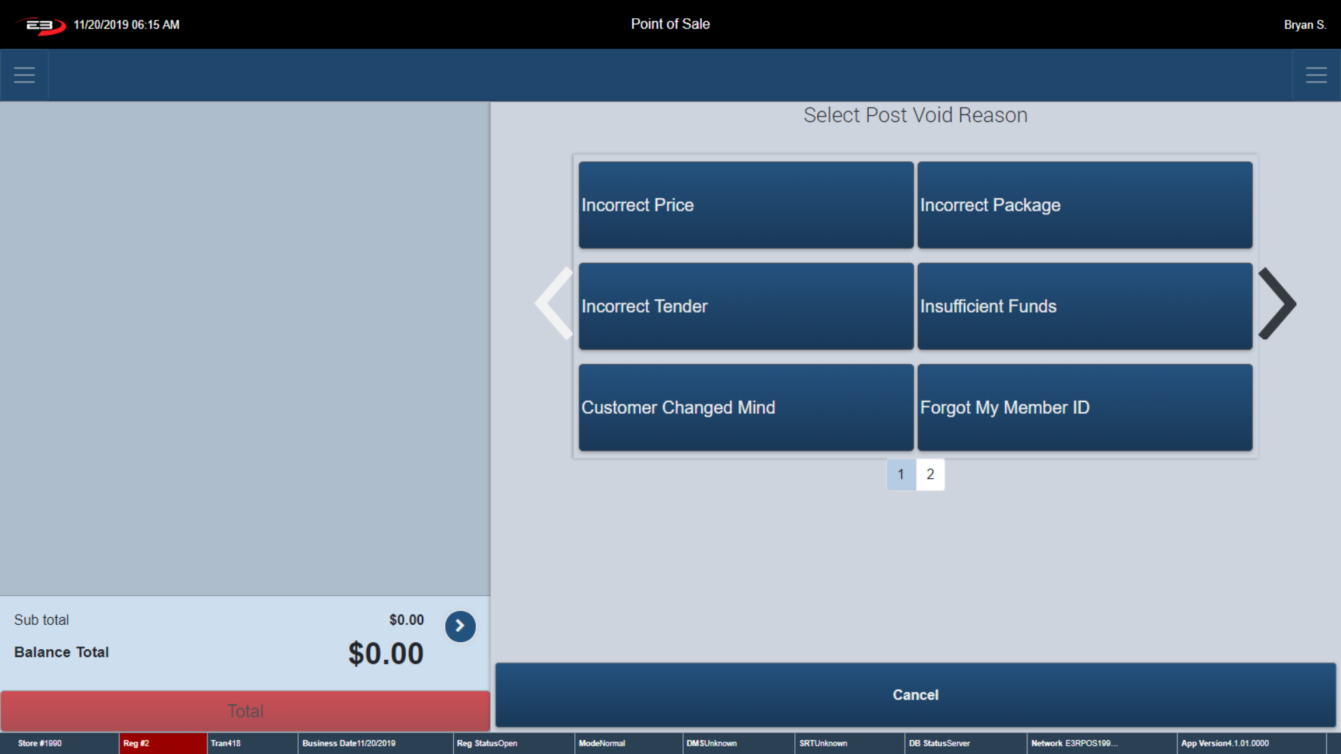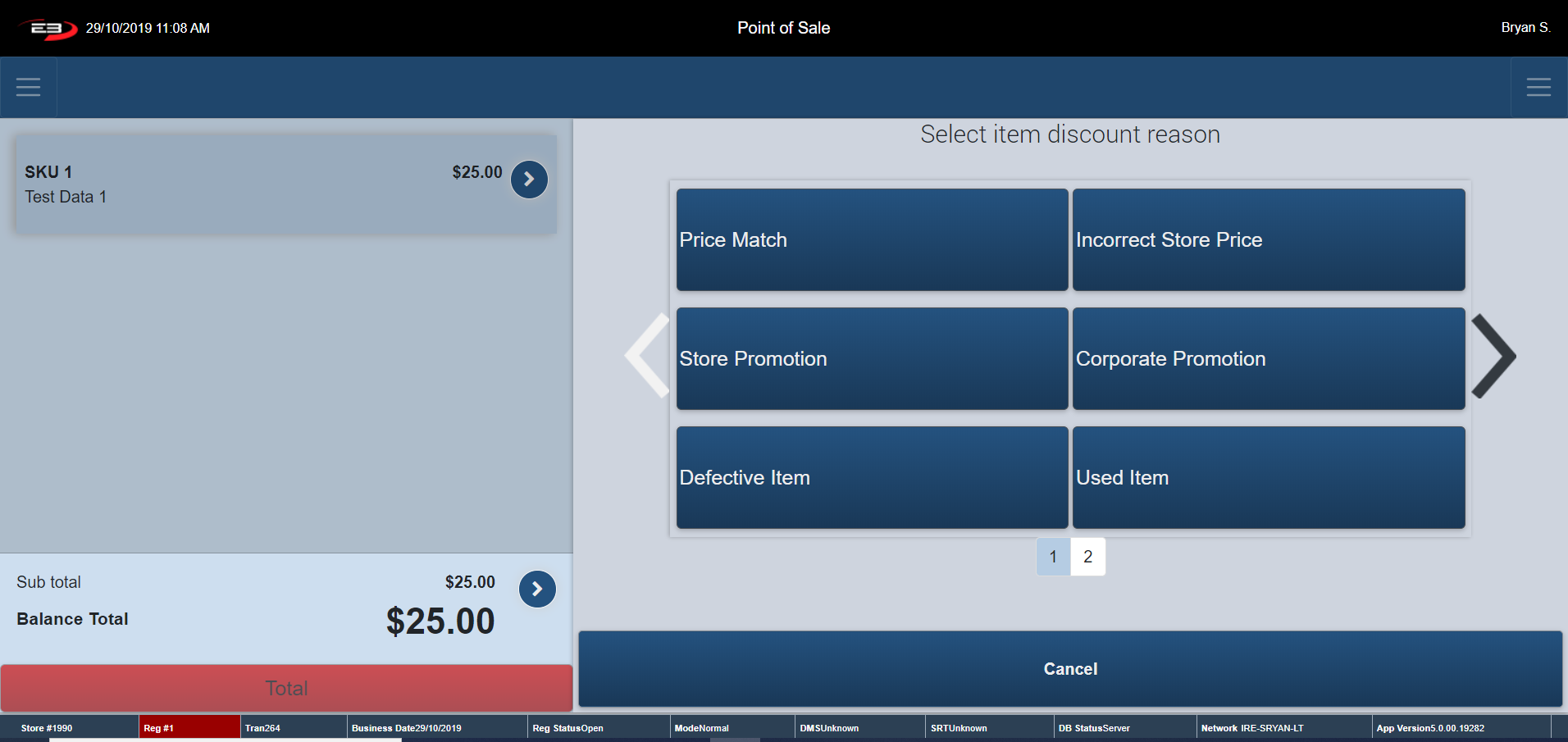 Click Cancel, the register returns to Item Discount Reason Screen.