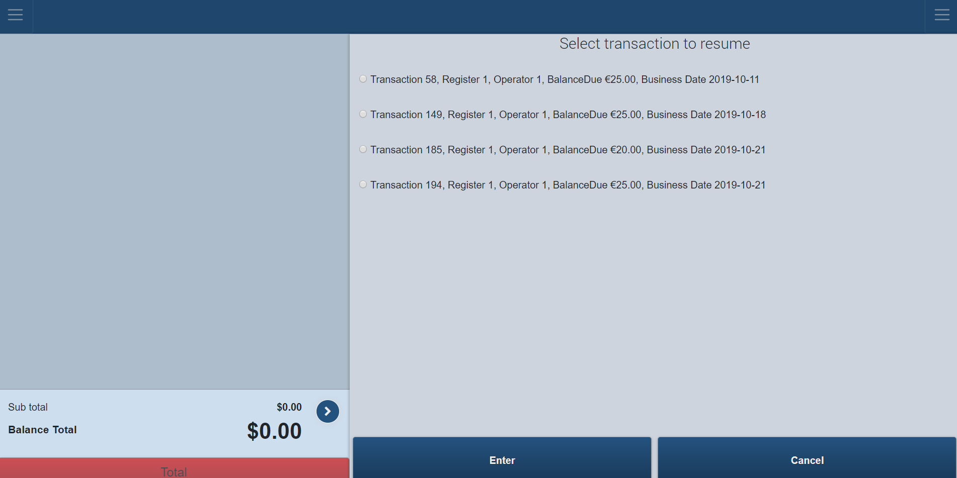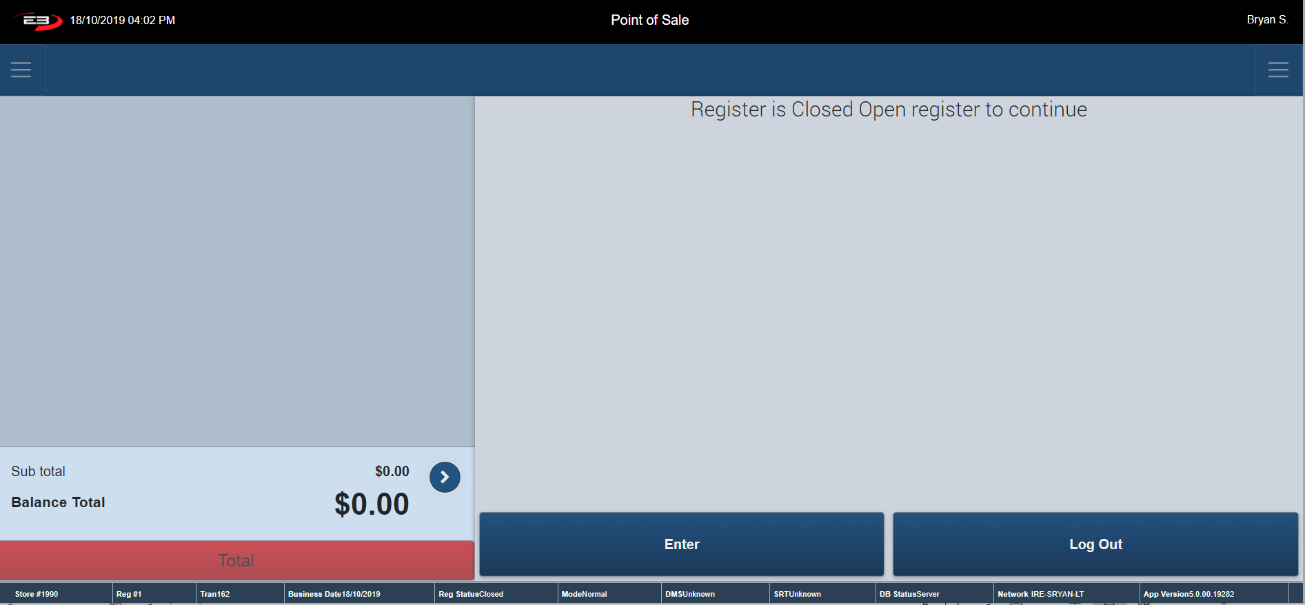 Initially the register is closed - click Enter to open the register or click Log Out to go back to the Login page. The register must be opened before a transaction can be performed.