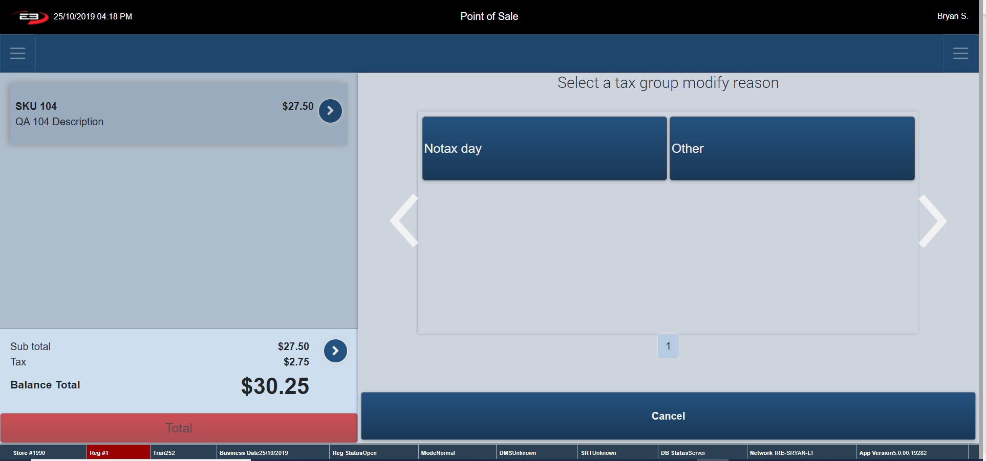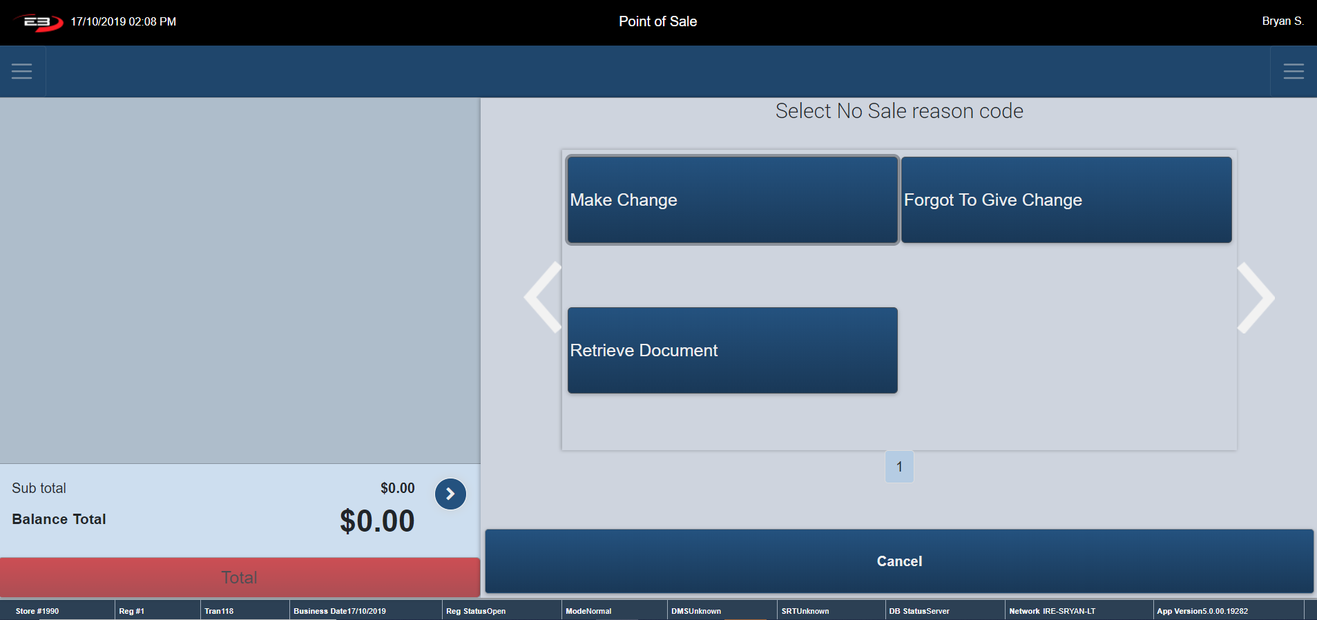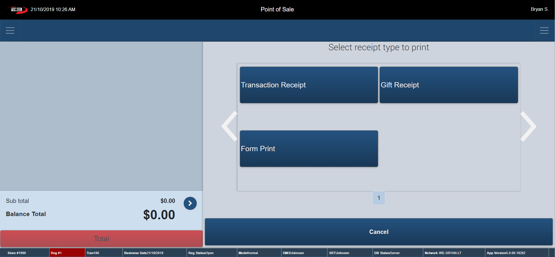 Click Cancel – the register returns to the Tender Type Option Screen.