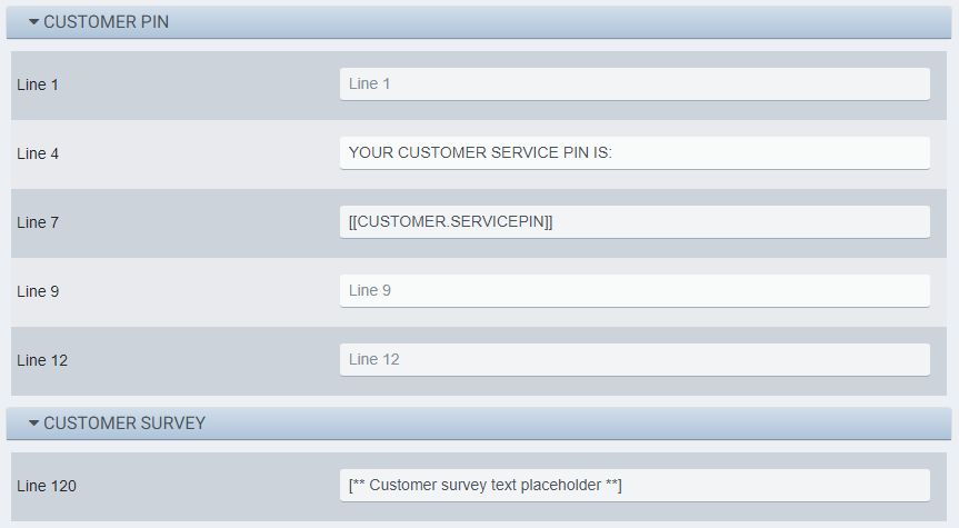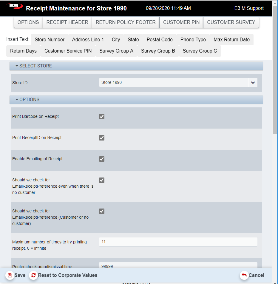 If you are modifying any of the lines in these sections and click an Insert Text button, a field is inserted in the receipt line that will be replaced with the field’s value when the receipt is printed. For example, Store Number will be replaced with Store 1990 on the actual receipt for a register in Store 1990.