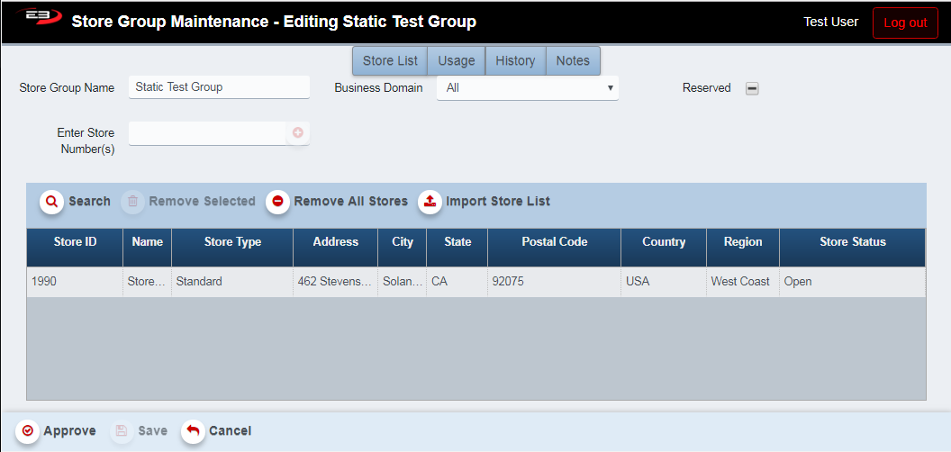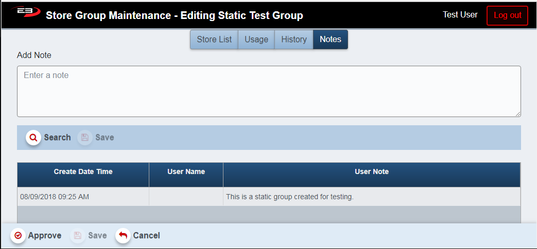 The Notes tab allows a user to enter plain-text notes related to this particular store group. Notes can be added to a group without having to change the status of the group (i.e. you don’t have to re-approve the group to add a note.)