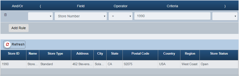 Click Refresh, any stores whose postal code is 92075 will no longer appear in the results.