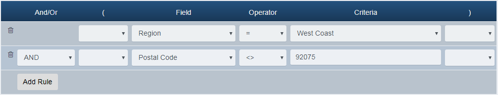 Click Add Rule to add the rule that will exclude all stores whose Postal Code is 92075, a new rule appears.