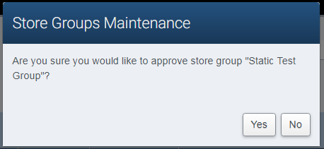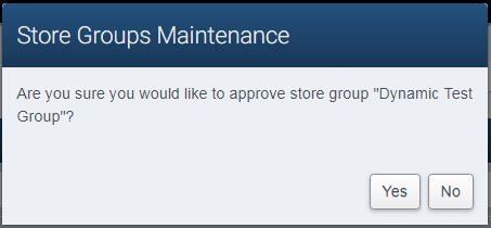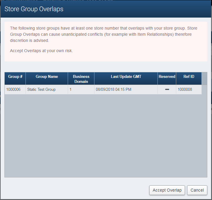 When creating store groups, it’s possible to have two groups which share stores in common. This is referred to as Overlap, and can cause problems with Item Relationships, Promotions, and other areas. When approving a group, if the application detects store group overlap, it will notify the user with the pop-up shown below which details which group(s) conflict with the group the user is trying to approve. Click Accept to accept the overlap(s) and continue the approval, otherwise click Cancel to cancel the approval.