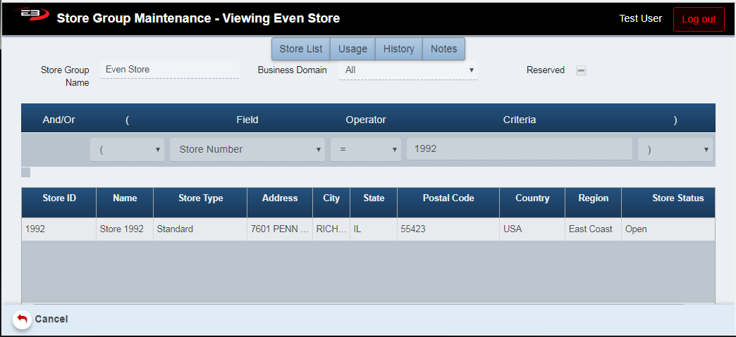 | Store Status | = or <> | Open in progress, Open, Close in progress, Closed (drop-list) |