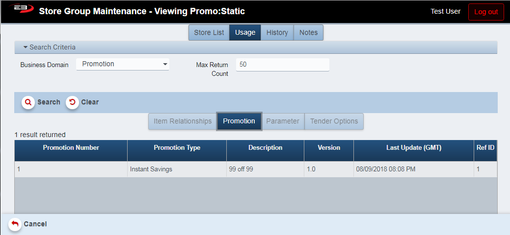 In this example, the group Promo:Static was used for the 99 off 99 promotion (the group contains two stores) and as can be seen, with the Business Domain set to Promotion the associated promotion appears in the result set.