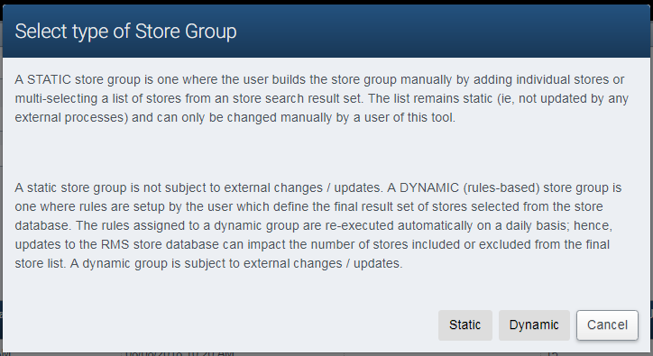 A static store group is a group whose member stores are added when the group is created or modified by manually selecting the store(s) to add or remove. This list of stores does not change unless a user edits the group and changes the store list.