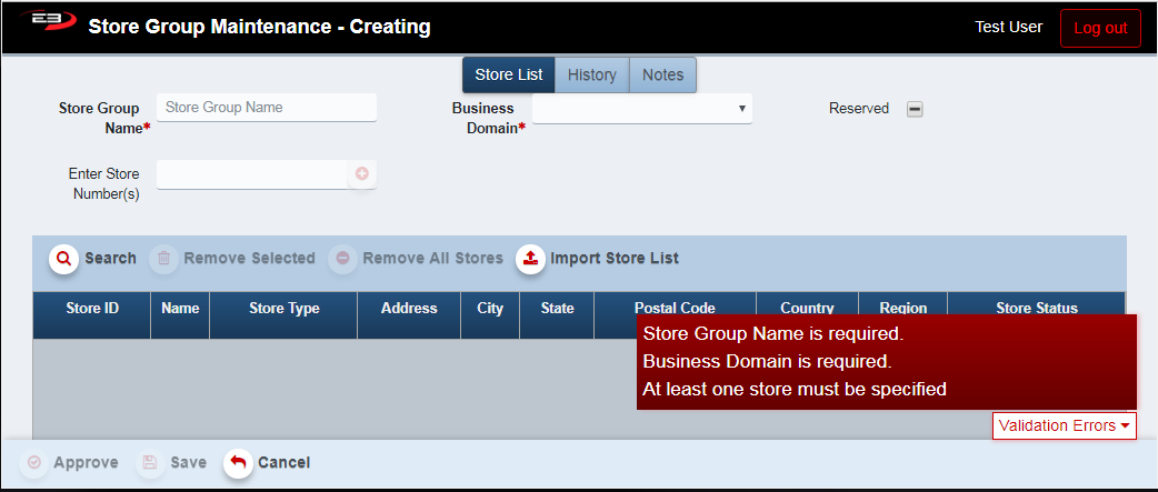 Note the validation errors. The Store Group Name and Business Domain are required fields.