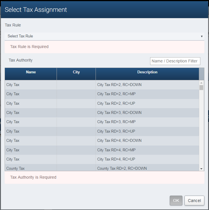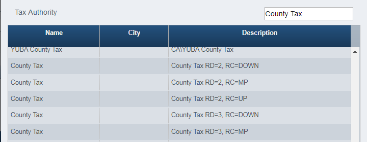 In an emergency, if the appropriate tax authority cannot be found in the system, the user can search for the following generic Tax Authorities which have specific rounding digits and rounding codes defined. In the search by description text box, search for the text “State Tax”, “County Tax”, “City Tax”, or “District Tax”.