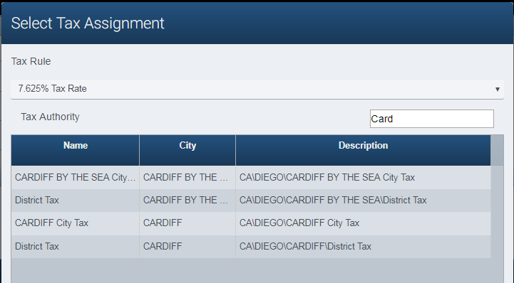 To search for for a specific Tax Authority (County, City, other) entry for the given store’s state or province, use the Search Filter to narrow down the result set. In the example below, the user has entered the text to limit the result set to the authorities that have the text “Card” in the tax authority description.