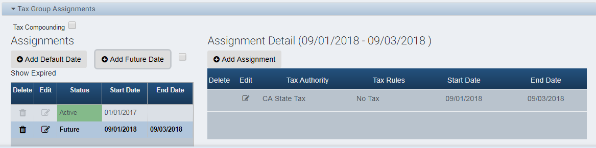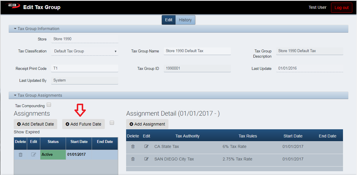 To setup different tax rates for a specific date range (for example, a state tax free holiday), select the “Add Future Date” icon.
