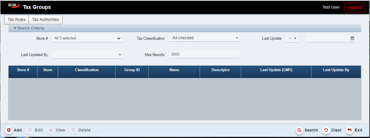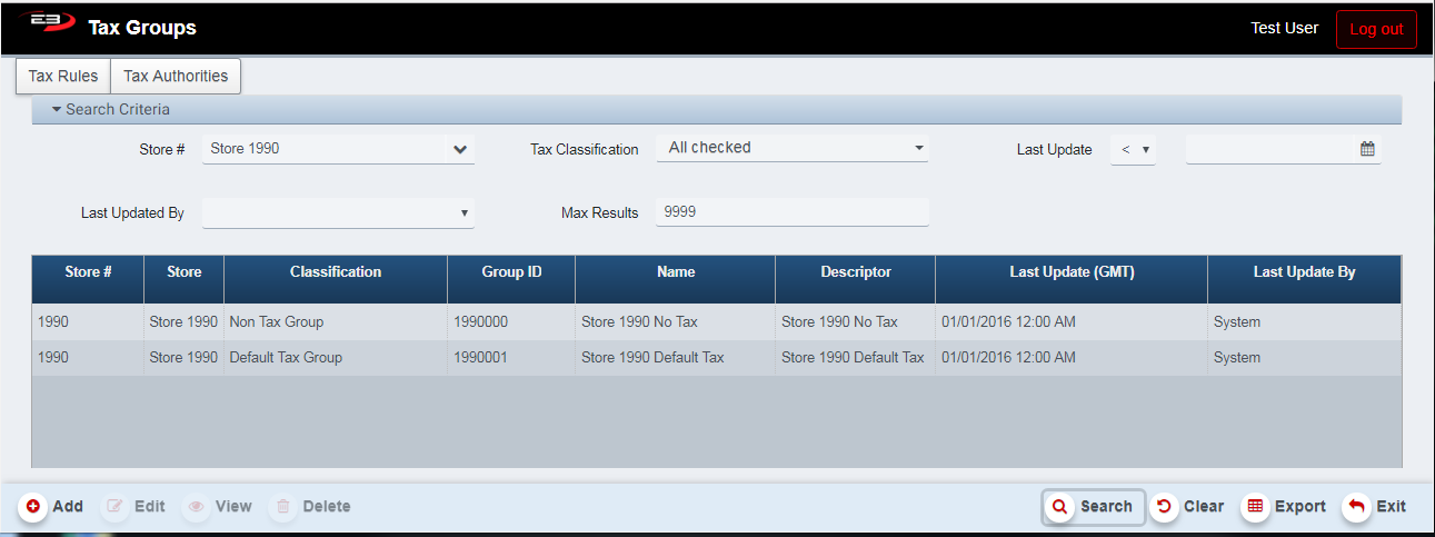 The search result set should display. By default, the “Non Tax Group” for the store (in our example, Store 1990) should display at a minimum.