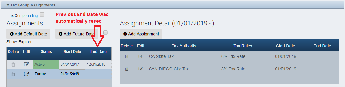 In the example below, the “city tax” for San Diego was changed to 3% (from 2.75%) effective 01/01/2019, and the previous default tax setup’s end date was automatically set to 12/31/2018.