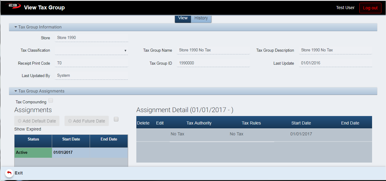 Every store should have a “Non Tax Group” already defined. The user may VIEW this tax group, but should not be permitted to edit this default Tax Group. A Non Tax Group looks like this.