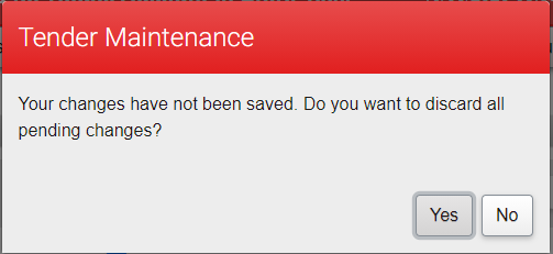 a. Click Yes to discard the changes and return to the tender type selection screen.