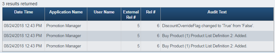 After the search criteria have been set and the user clicks Search, the audit log entries are displayed in a grid. The columns in the result grid are: