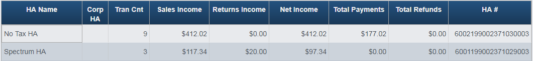 The result grid shows the various house accounts with transactions that met the search criteria, this is the default display. The columns in the result grid are: