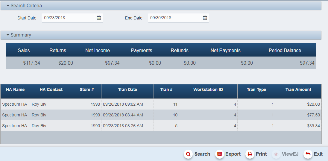 To see the transaction details for a house account, click on the house account row in the results grid and then click Transaction Details. The results will display as seen here, with a summary row on the top and then a grid of the individual transactions below. You can click on a single transaction and then click ViewEJ which will display the electronic journal entry for the transaction; click Exit to leave the EJ viewer and return to the transaction details.