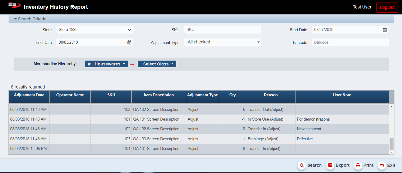 The results grid displays the inventory adjustments based on adjustment actions as listed in the search criteria. Note that this report does not cover inventory changes to to sales and returns.