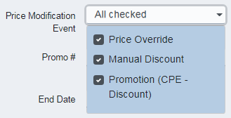 The Price Modification Event list allows the user to search on any combination of events, defaults to all.