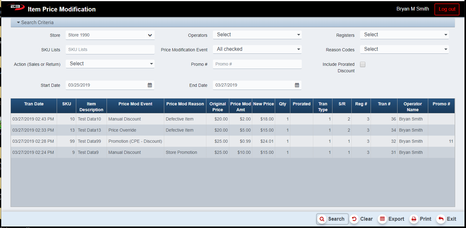 The Print function allows the user to save the report as an Acrobat PDF file for viewing/printing in Adobe Acrobat Reader. Once you have a result set that’s filtered as desired, click the Print button. The file is saved as ItemPriceModification.pdf in the default location, typically the Downloads folder for the user.