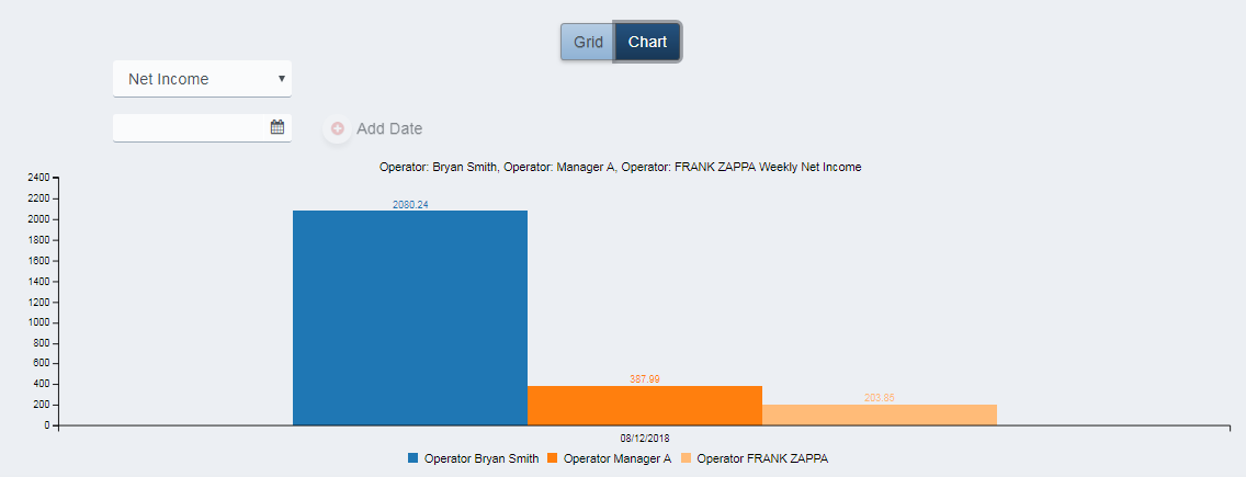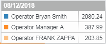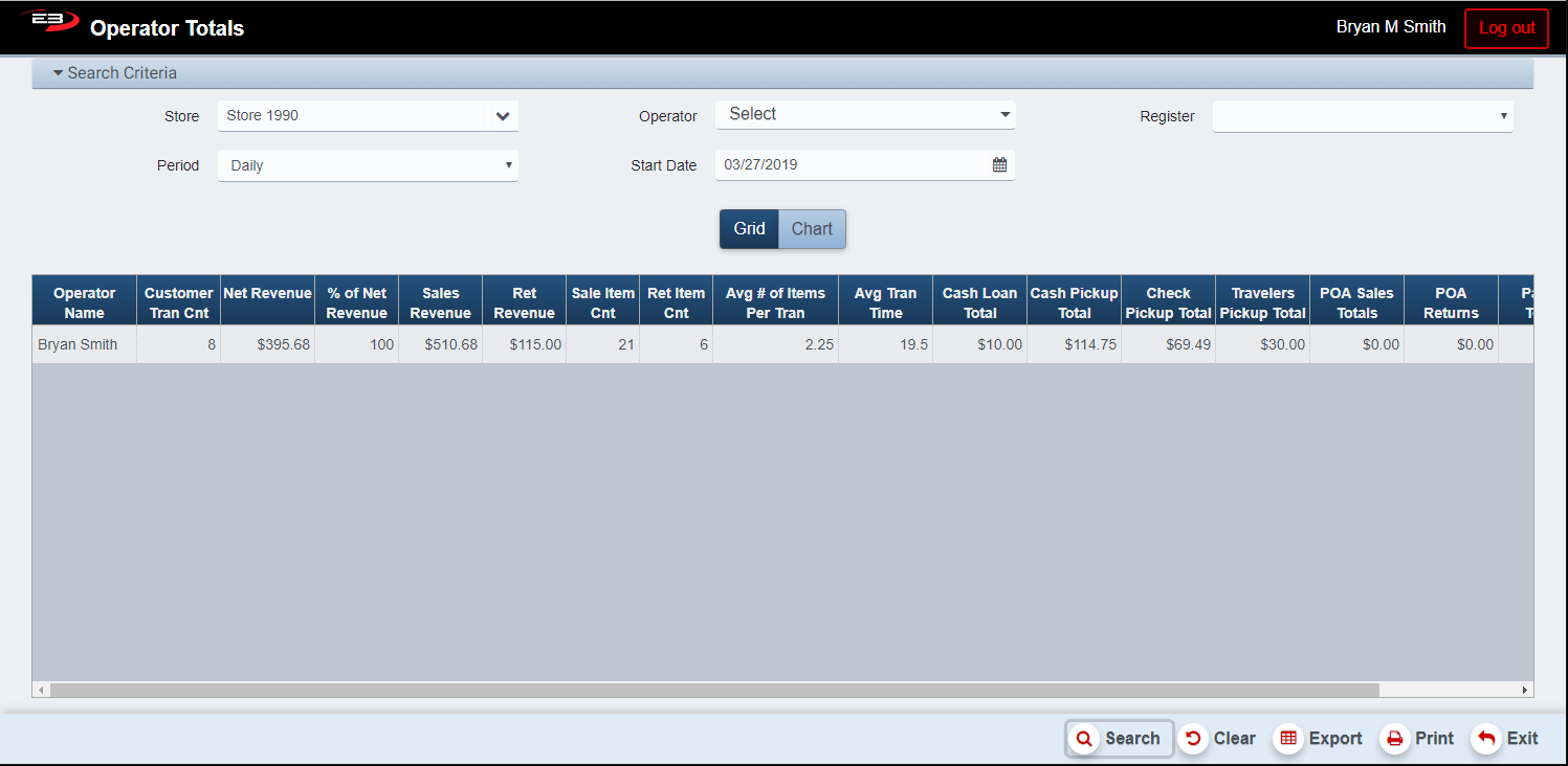 By default, the results are displayed in grid. Each operator with results from the selected store and period, and optionally from the selected register, gets a row in the results. If more than one operator has a row in the grid, a summary row is also displayed.