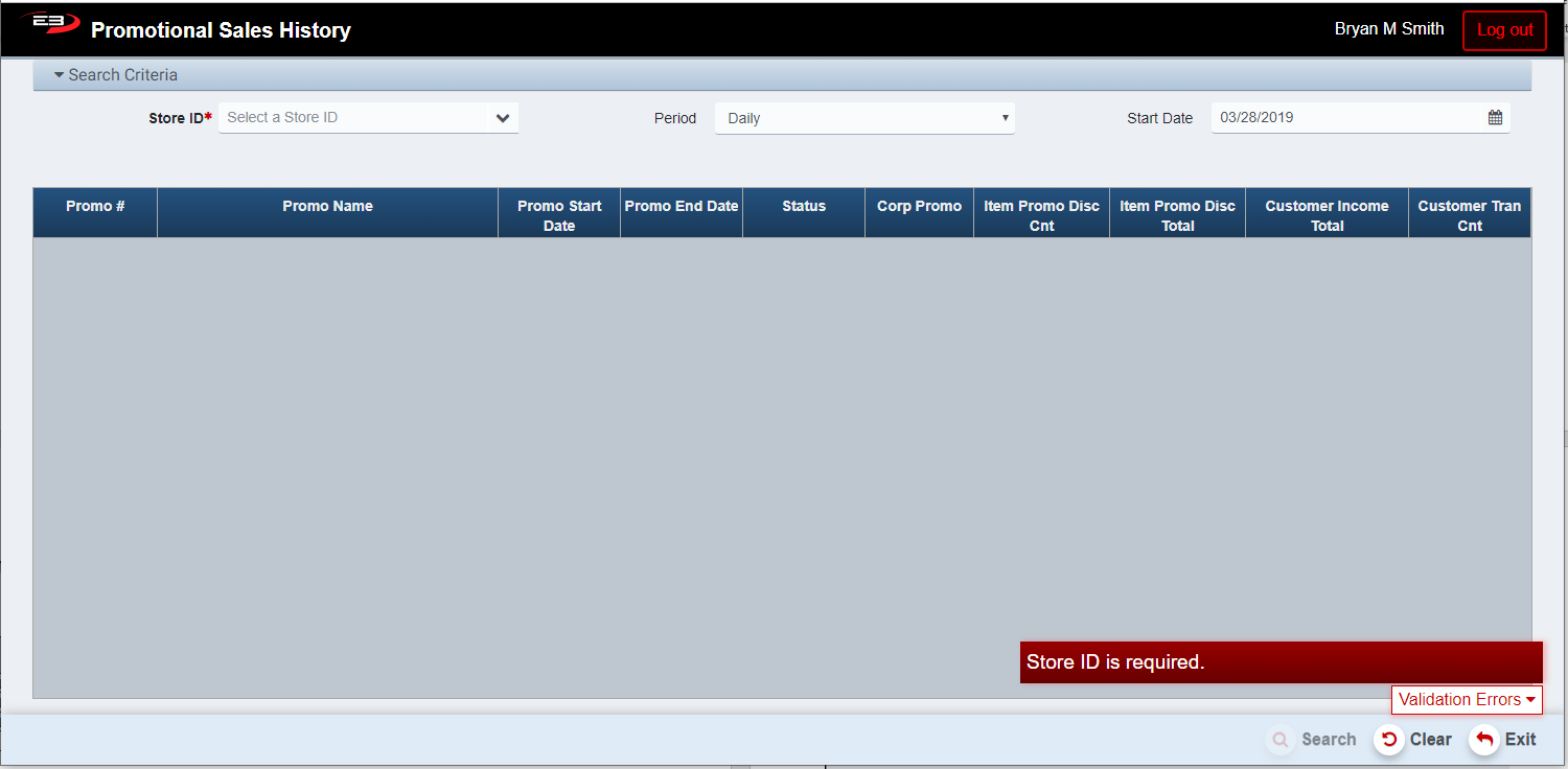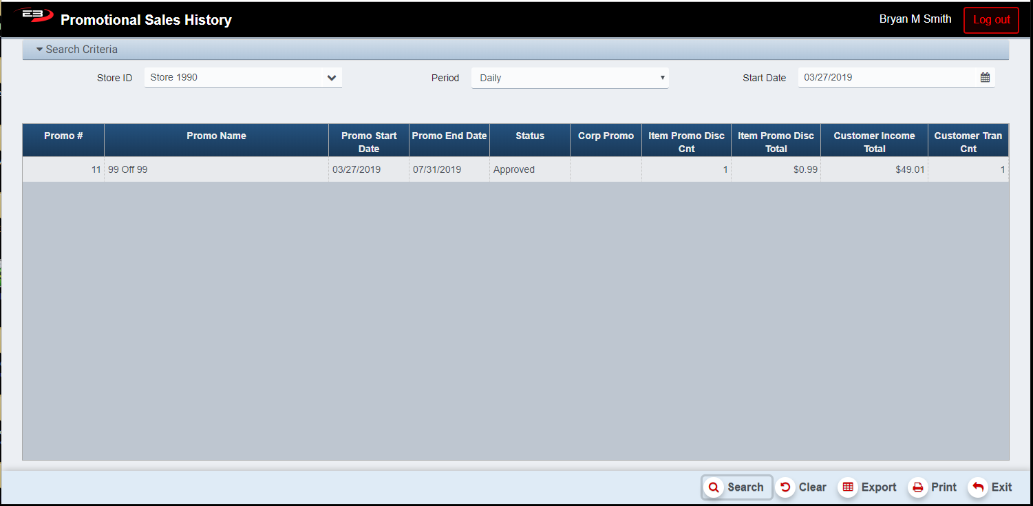 The Print function allows the user to save the report as an Acrobat PDF file for viewing/printing in Adobe Acrobat Reader. Once you have a result set that’s filtered as desired, click the Print button. The file is saved as PromotionalSalesHistory.pdf in the default location, typically the Downloads folder for the user.