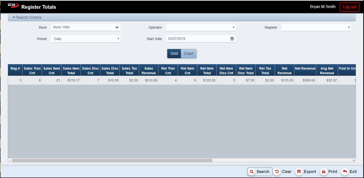Once the store is selected, visible operators and registers are selectable from the Operator and Register criteria.